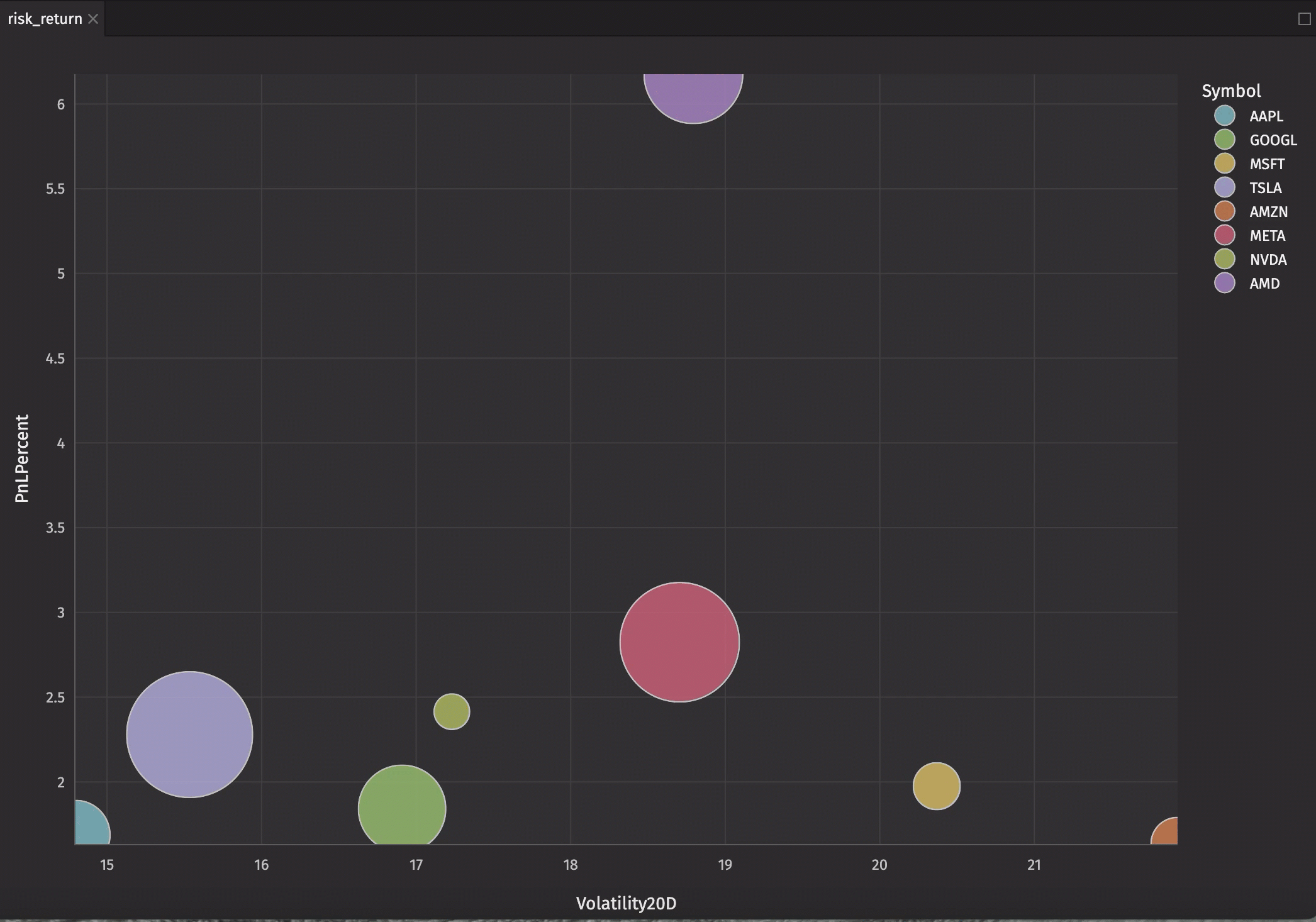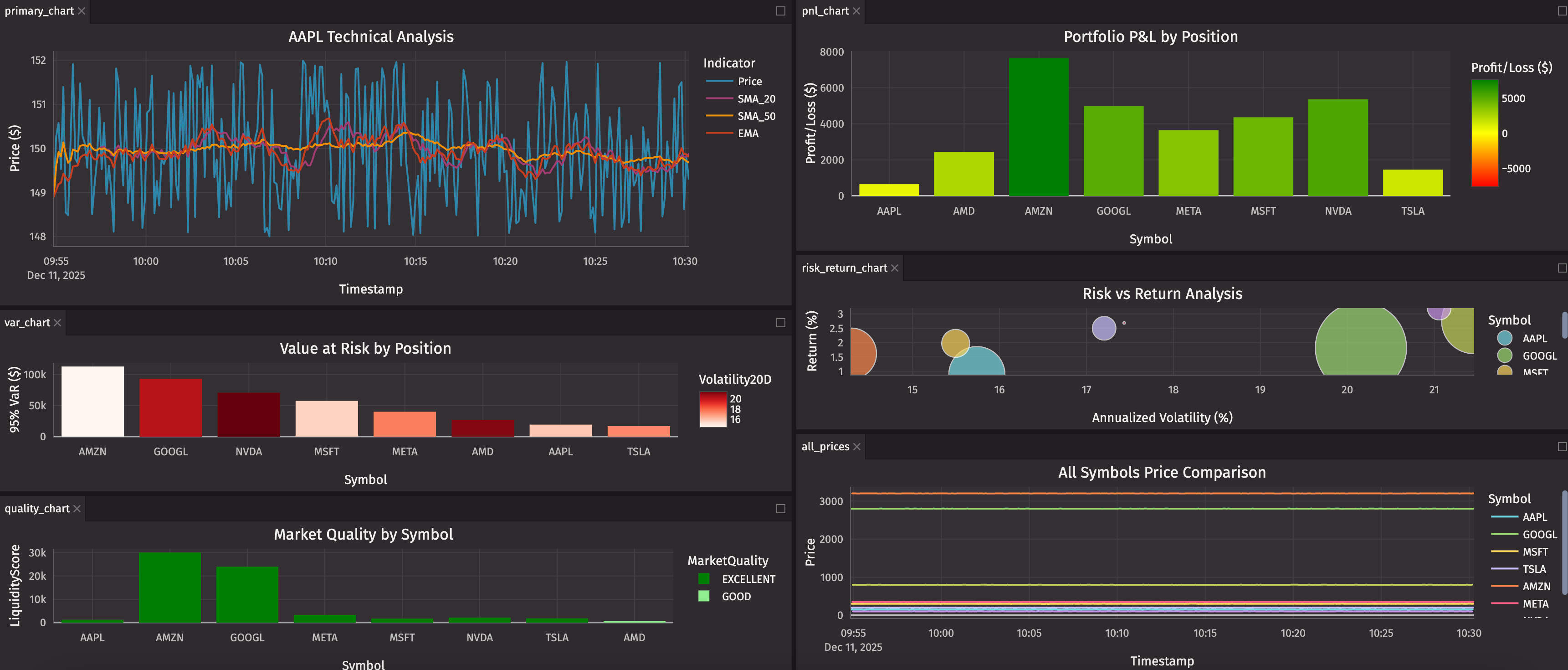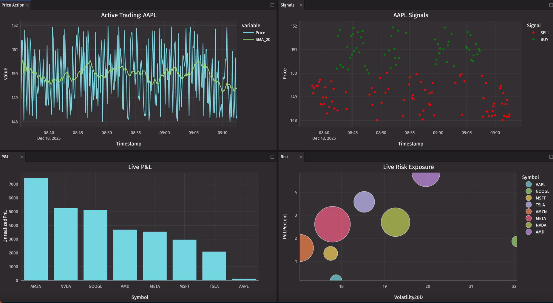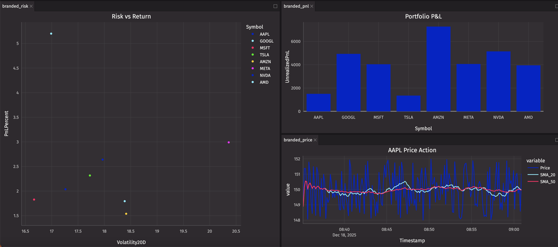 Those questions need custom visualizations. Plotly Express gives you the power to combine multiple data dimensions in a single view — risk vs return, price vs volume vs signal, P&L vs volatility — all updating in real-time as market data flows in.