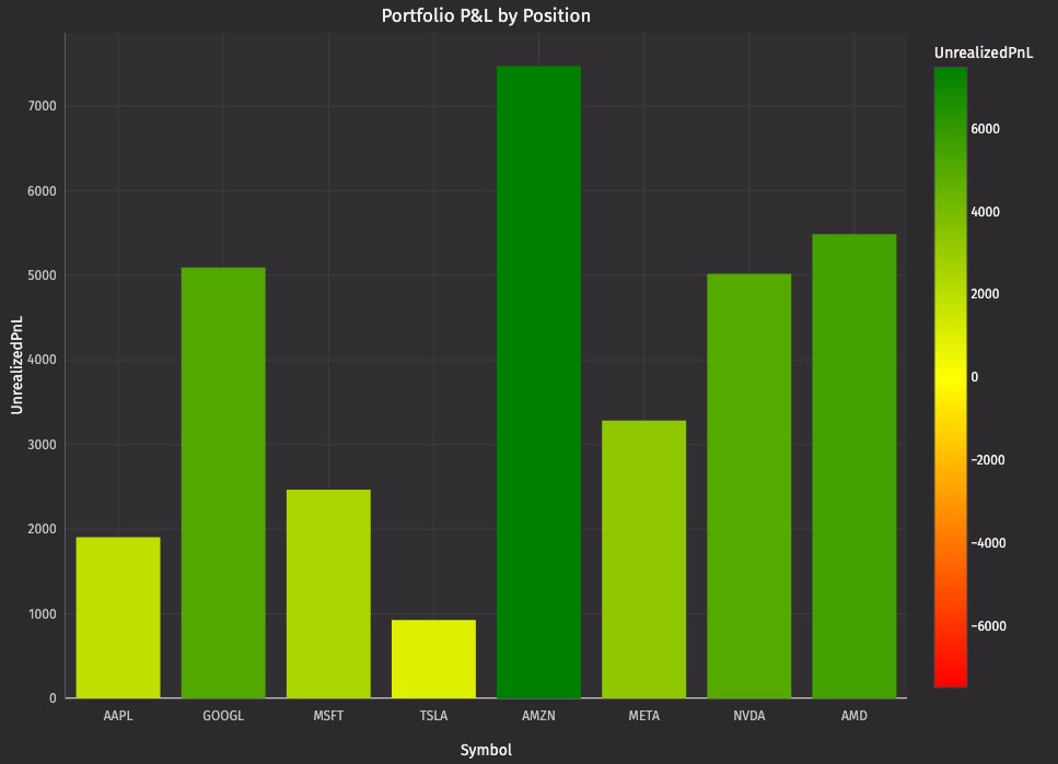 This post demonstrates visualization techniques using simplified trading concepts. The financial calculations and risk metrics shown are for educational purposes only and should not be used for actual trading decisions. Real-world trading systems require significantly more sophisticated analysis, proper risk management, regulatory compliance, and professional financial advice. This is not financial or investment advice.