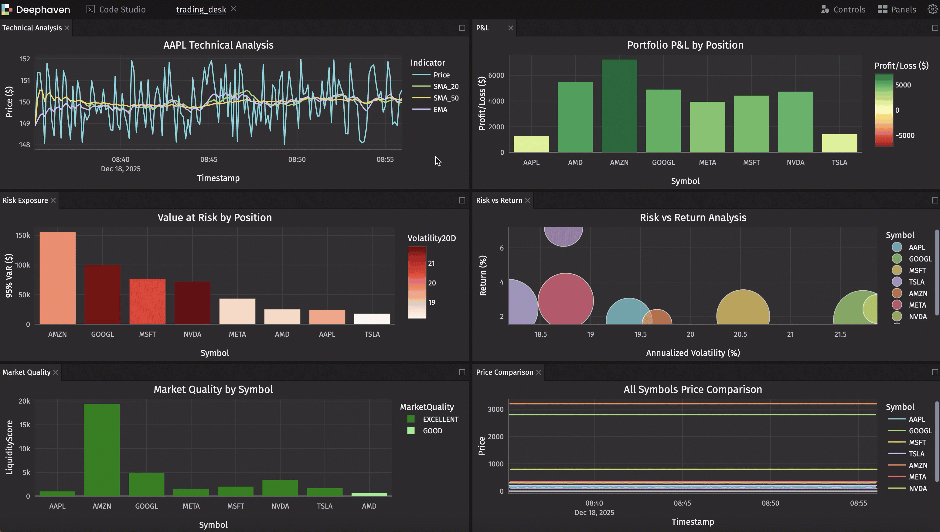 The combination of Deephaven's real-time table engine and its visualization/UI tools creates a platform where you can build, analyze, and visualize trading systems faster than you ever thought possible.