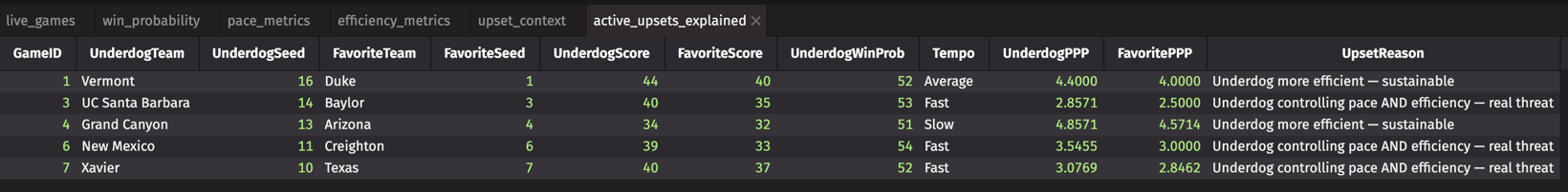 This post adds a contextual layer to the command center we built in Part 2: win probability, pace of play, and efficiency metrics. When you're done, your dashboard won't just flag upsets: it'll tell you which ones are flukes and which ones are likely to hold.