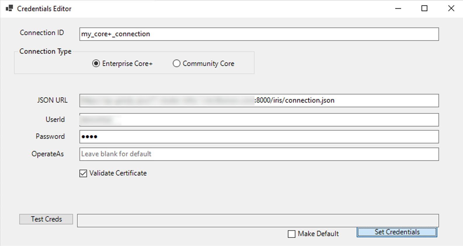 Before setting the Connection ID and Connection String, click Test Creds to ensure the connection is valid. Finally, click Set Credentials to save the connection.