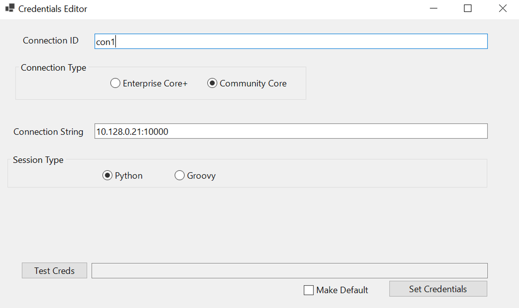 Before setting the Connection ID and Connection String, click Test Creds to ensure the connection is valid. Finally, click Set Credentials to save the connection.