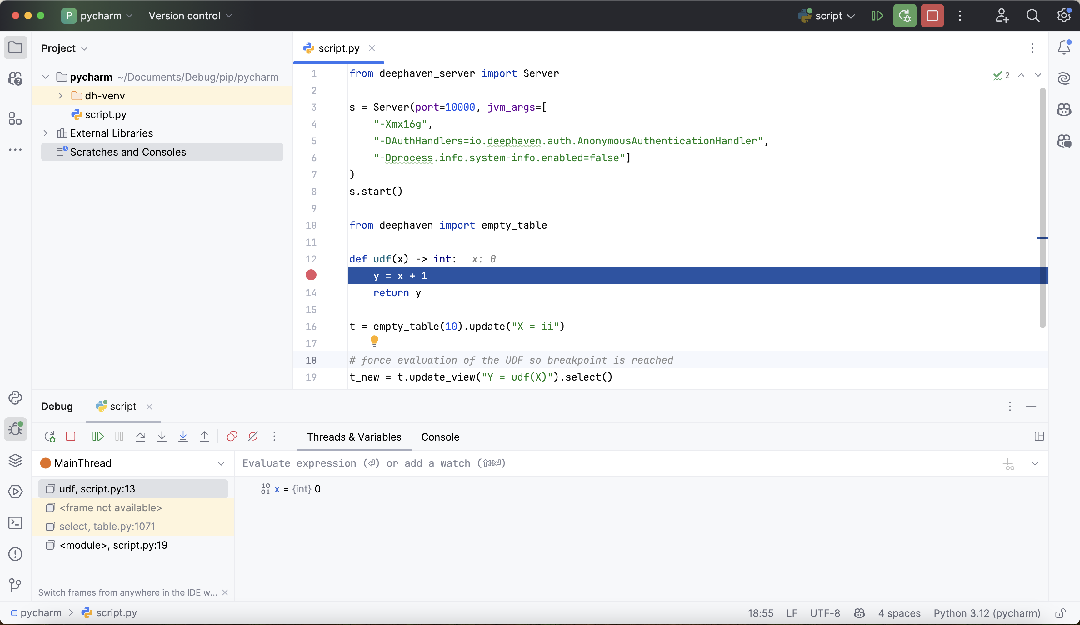 Some Deephaven table operations like update_view utilize lazy evaluation, where the results of the operation are not computed until they are required by another downstream operation. In the absence of such downstream operations, the debugger may not hit the expected parts of the code since no real work is being done. This is particularly salient when attempting to debug user-defined functions called in lazy table operations. Take this example: