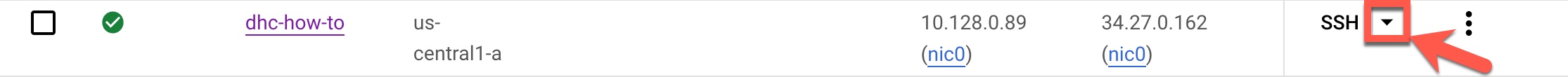 <ZONE>is the zone you created your VM in. For this guide, we created it inus-central1-a.<INSTANCE>is the name of the VM. For this guide, we called itdhc-how-to.<PROJECT>is the name of your gcloud project. This can be found in the URL when you go to the web interface at the end. It looks like?project=<PROJECT_NAME>.-NLdoes two things.- The first,