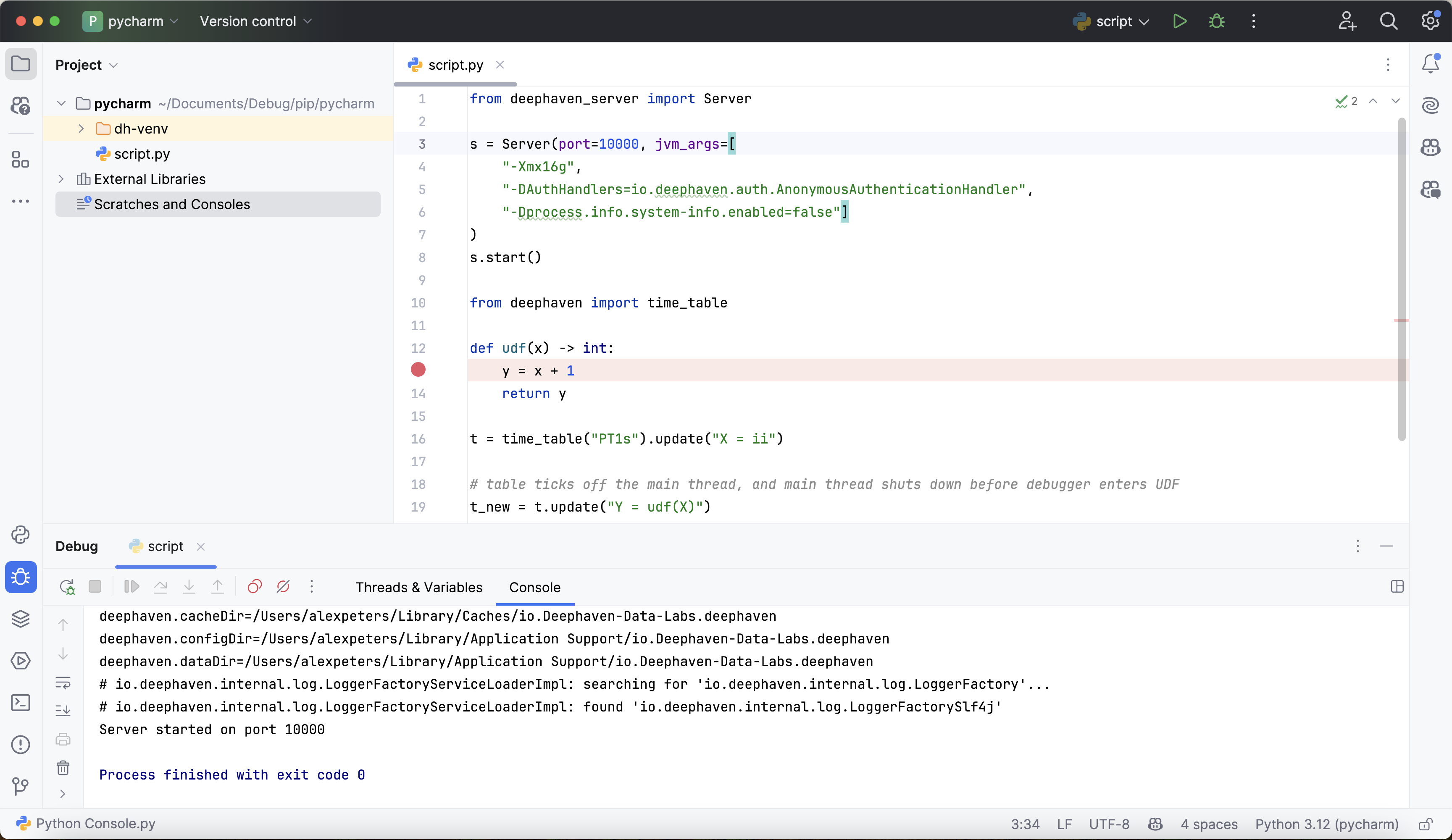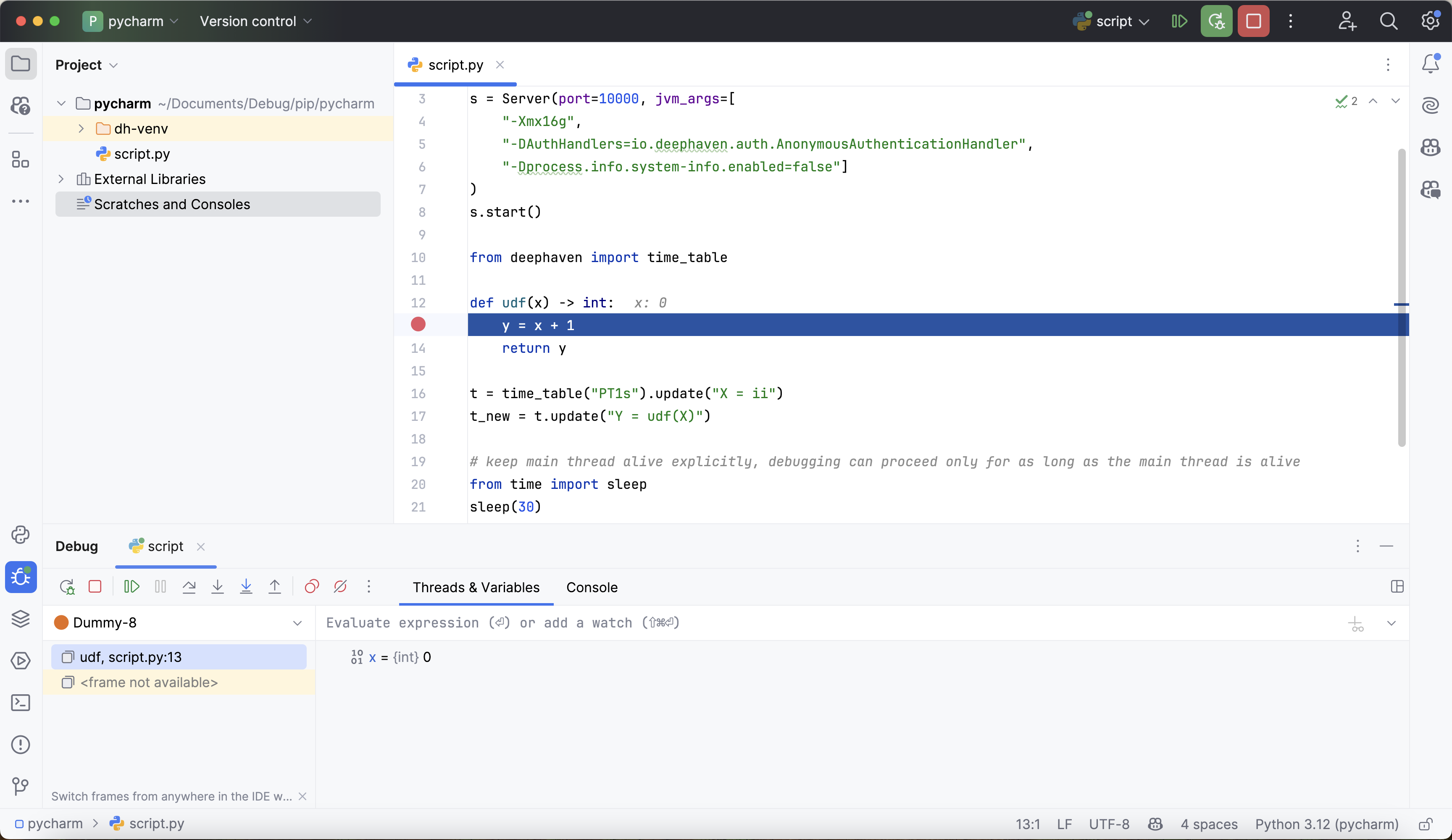 Some Deephaven table operations like update_view utilize lazy evaluation, where the results of the operation are not computed until they are required by another downstream operation. In the absence of such downstream operations, the debugger may not hit the expected parts of the code since no real work is being done. This is particularly salient when attempting to debug user-defined functions called in lazy table operations. Take this example:
