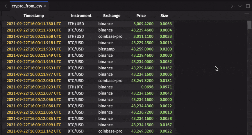 Ingesting real-time data is one of Deephaven's superpowers, and you can learn more about supported formats from the links at the end of this guide. However, streaming pipelines can be complicated to set up and are outside the scope of this discussion. For a streaming data example, we'll use Deephaven's Table Replayer to replay historical cryptocurrency data back in real time.