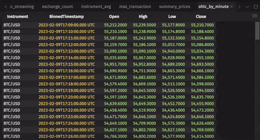 Finally, create a minute-by-minute Open-High-Low-Close table using the lowerBin built-in function along with first, max_, min_, and last: