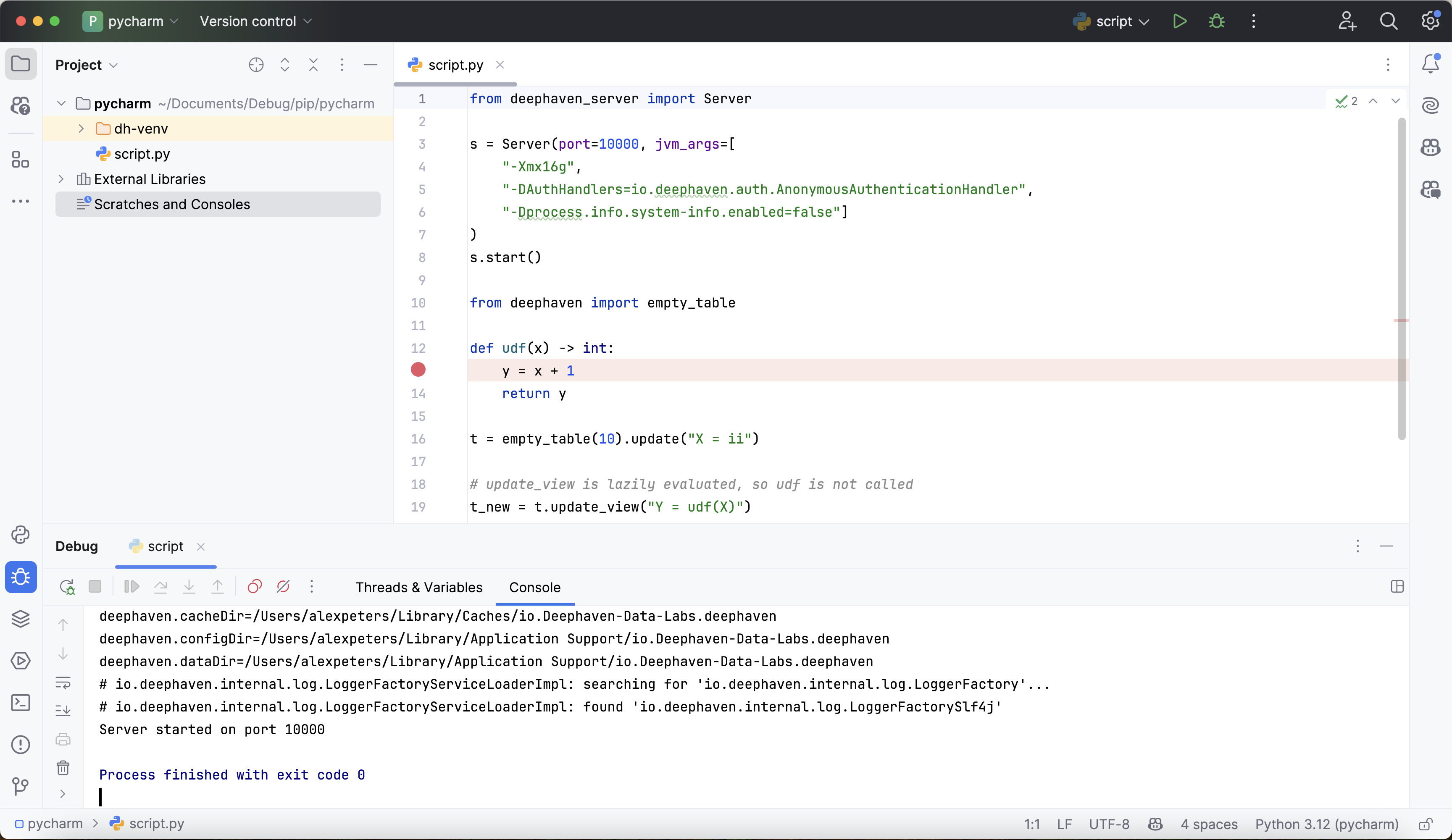 Some Deephaven table operations like update_view utilize lazy evaluation, where the results of the operation are not computed until they are required by another downstream operation. In the absence of such downstream operations, the debugger may not hit the expected parts of the code since no real work is being done. This is particularly salient when attempting to debug user-defined functions called in lazy table operations. Take this example:
