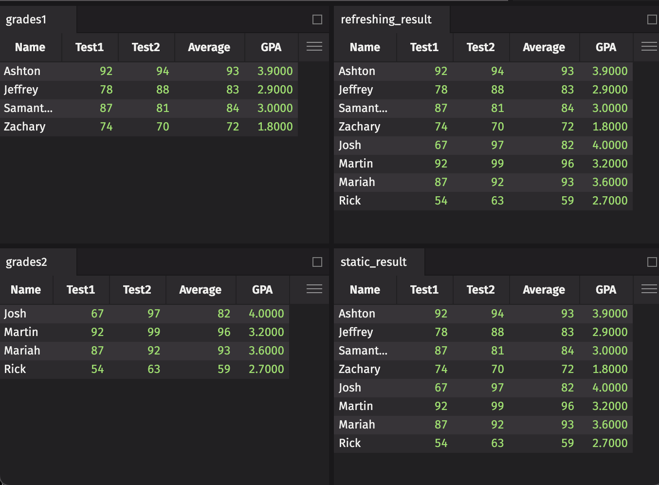 The four above tables, displayed in a 2x2 grid in the Deephaven UI