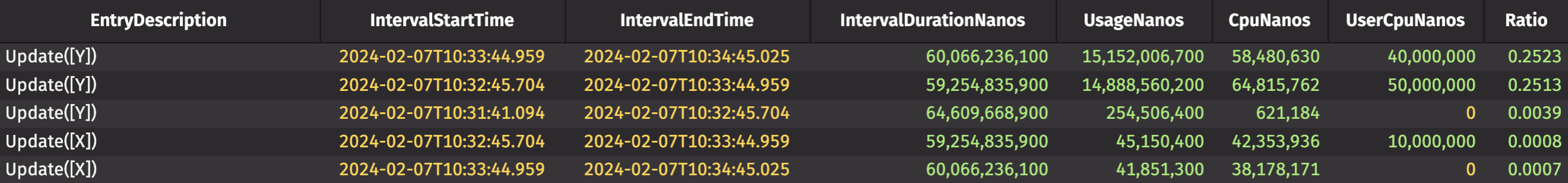 fastandslowdo the same thing.slowis slow because it waits for 1/4 of a second to perform and return the calculation. upl_updateadds two columns:IntervalDurationNanosandRatio.Ratiocalculates the percent of the interval that was spent performing a particular operation. The table is also sorted byRatioin descending order so that the operations that take the most time show up at the top.