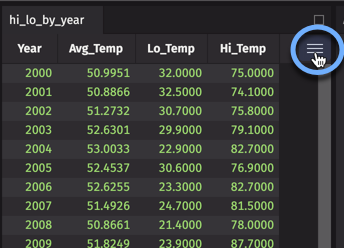 From the hi_lo_by_year table, let's chart the average temperature for each year. Click Create to generate a single series plot.
