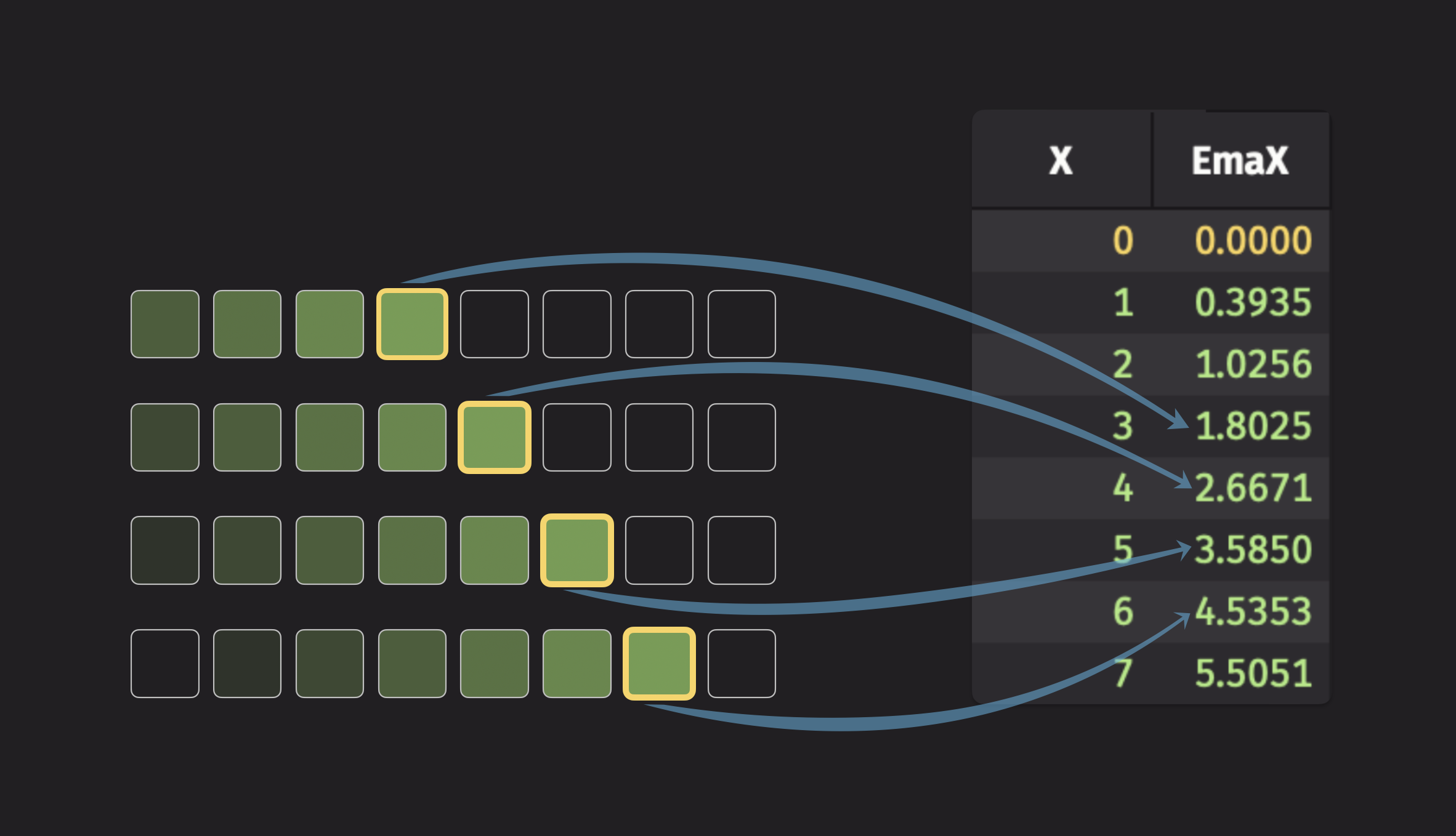 To illustrate an exponential moving statistic, consider the exponential moving average (EMA). Here's a visualization of the EMA: