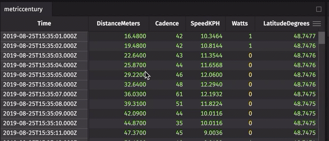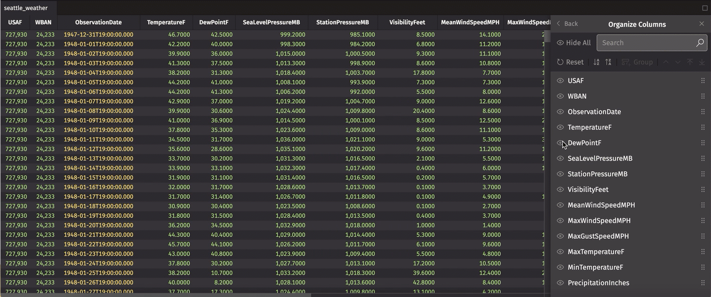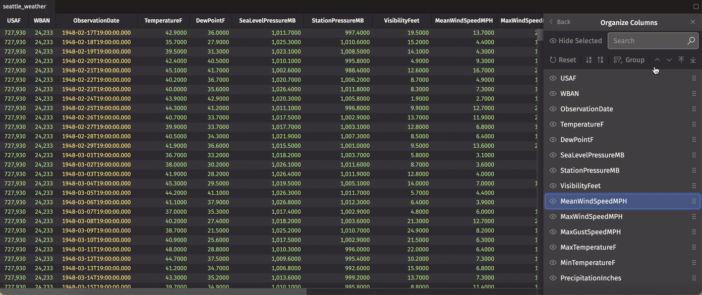 You can also create one or more column groups in your table. This is useful for organizing columns into logical groups. In the example below, we organize the weather data related to speed into a single group. Simply click Group, then drag-and-drop the columns you wish to include. After you name the group, click the Check icon to save: