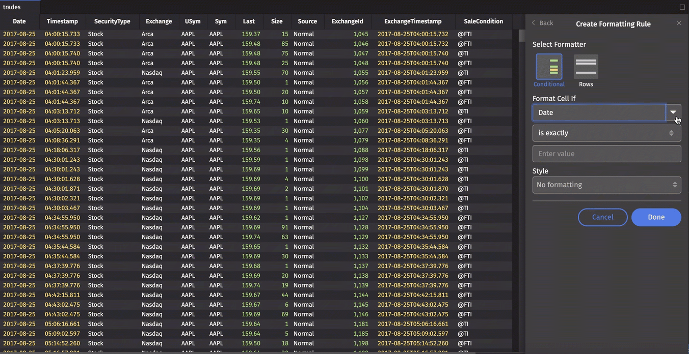 In the example below, all cells in the Exchange column containing the value "Arca" will be colored in the "Positive" style: