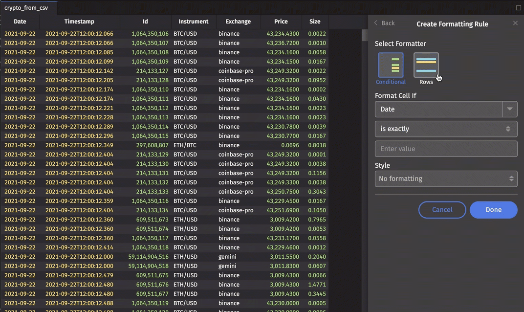 This guide shows you how to format tables in Deephaven. This includes reordering and hiding columns, creating custom aggregation columns, applying color formatting to specific cells or rows, and more. All of Deephaven's tools for formatting tables can be accessed by using the column header context menu and the Table Options menu.