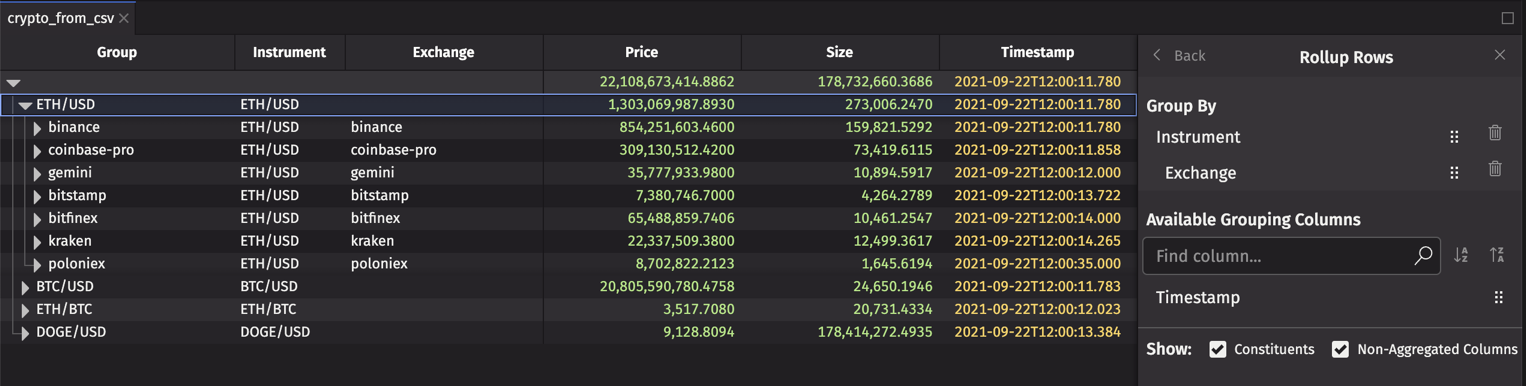Selecting multiple grouping columms will create a multi-level rollup table. In the example below, the table is grouped by "Exchange" and "Instrument".