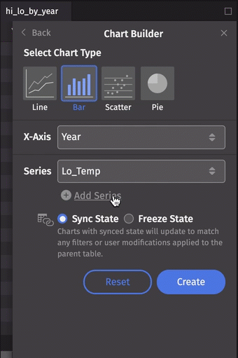 Let's make a multiple series bar chart. This time, we'll select the Lo_Temp column for our first series, then click Add Series and select Hi_Temp: