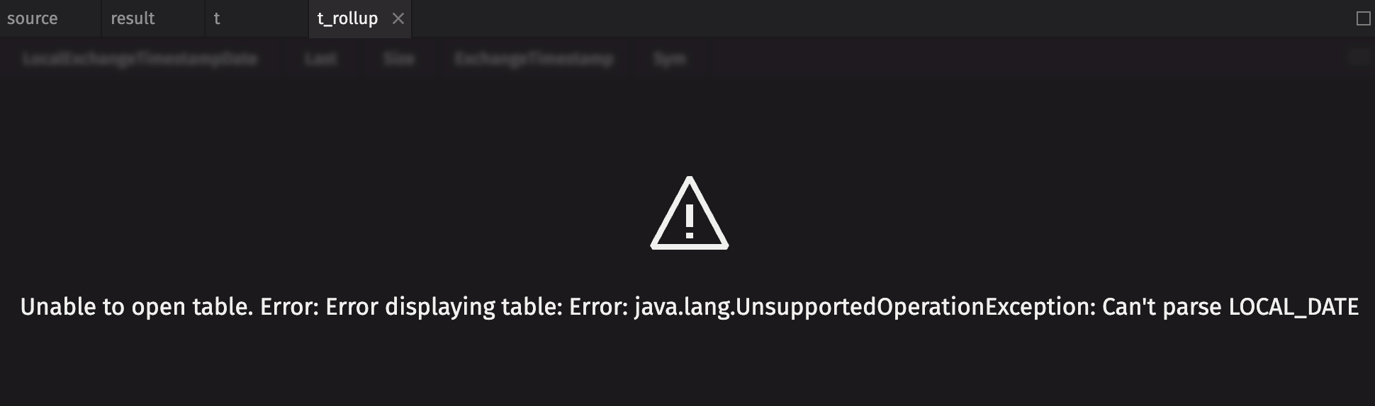 Note that rollup tables can only be created from String or primitive columns. Attempting to use a non-primitive type such as LocalDate or a Timestamp as a rollup column results in an error: