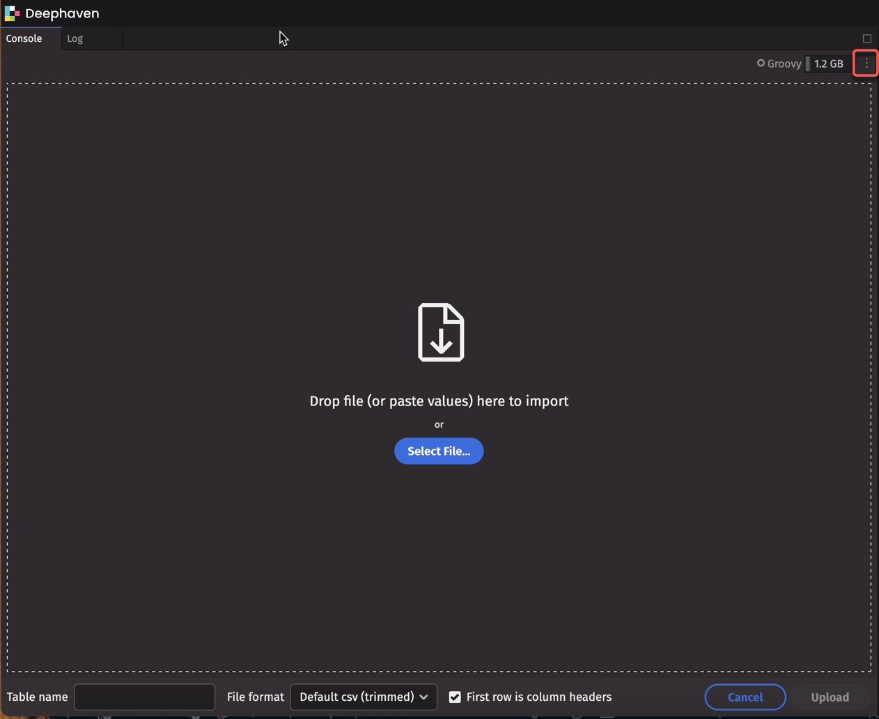 Deephaven lets you import a CSV or other delimited file directly from the UI and make it immediately available as a table in your session.