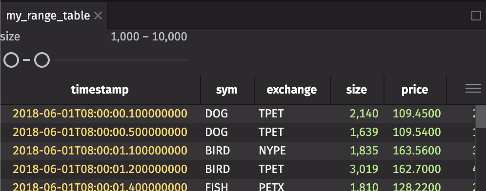 You can also filter a table based on a range. In this example, a range slider takes input from the user, and we filter the table by price based on the input. Simply returning the table t from the component will display it in the UI (as if we had set it to a variable name).