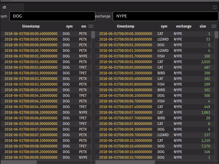 User input can filter a table using the where method. In this example, a text field takes input from the user, and we filter the table based on the input. Simply returning the table t from the component will display it in the UI (as if we had set it to a variable name).