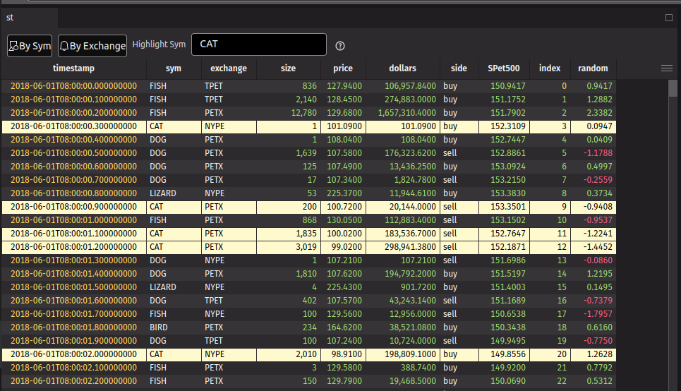 You can use the rollup method to create a rollup table. In this example, we create a rollup table that shows the average price of each stock and/or exchange. You can toggle the rollup by clicking on the ToggleButton. You can also highlight a specific stock by entering the symbol in the text field, but only when a rollup option isn’t selected. We wrap the highlight input field with a ui.fragment that is conditionally used so that it doesn’t appear when the rollup is selected. We also use the ui.contextual_help component to display a help message when you hover over the help icon.
