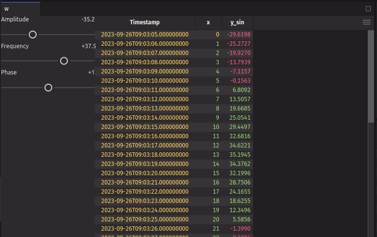 We can use the use_memo hook to memoize a value. This is useful if you have a value that is expensive to compute and you only want to compute it when the inputs change. In this example, we create a time table with a new column, y_sin, which is a sine wave. We use use_memo to memoize the time table, so that it is only re-computed when the inputs to the use_memo function change (in this case, the function is a lambda that takes no arguments, so it will only re-compute when the dependencies change, which is never). We then use the update method to update the table with the new column, based on the values inputted on the sliders.