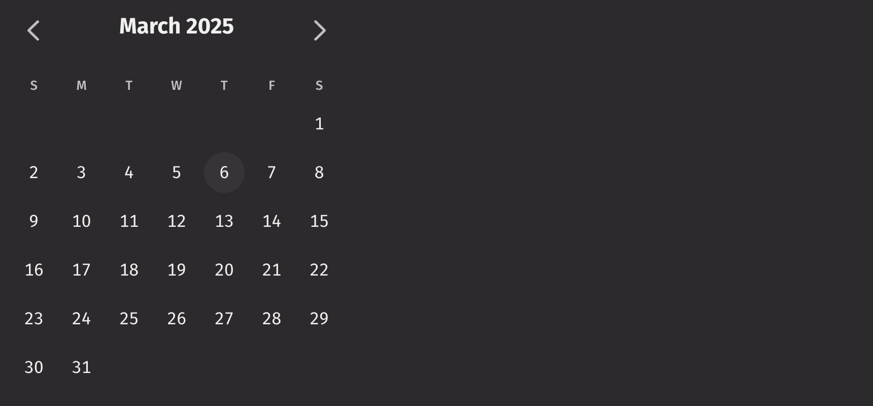 By default, the selected date is focused when a Calendar first mounts. If no value or default_value prop is provided, then the current date is focused. However, range calendar supports controlling which date is focused using the focused_value and on_focus_change props. This also determines which month is visible. The default_focused_value prop allows setting the initial focused date when the range calendar first mounts, without controlling it.