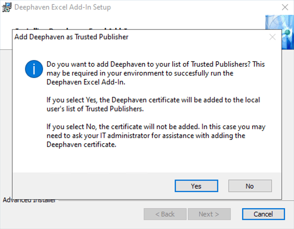 - Yes to add Deephaven to your computer's list of Trusted Publishers. This is needed so that Excel can run Deephaven code.