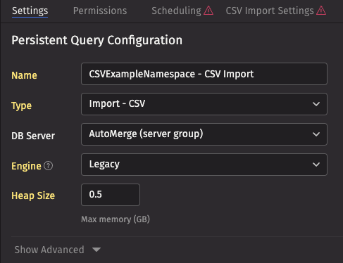 Once the schema has been deployed, define an Import - CSV Persistent Query (PQ) to ingest the CSV file. You'll need to be logged in to the Deephaven web interface as a data administrator to perform these tasks.