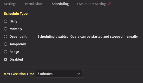 DisabledSchedule Type. - Set the Max Execution Time to