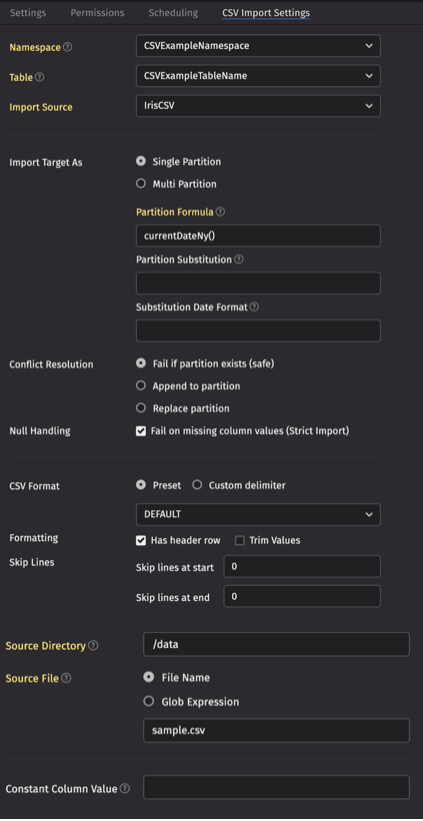 IrisCSV. - For the Import Target, click the Single Partition button, and fill in the Partition Formula with