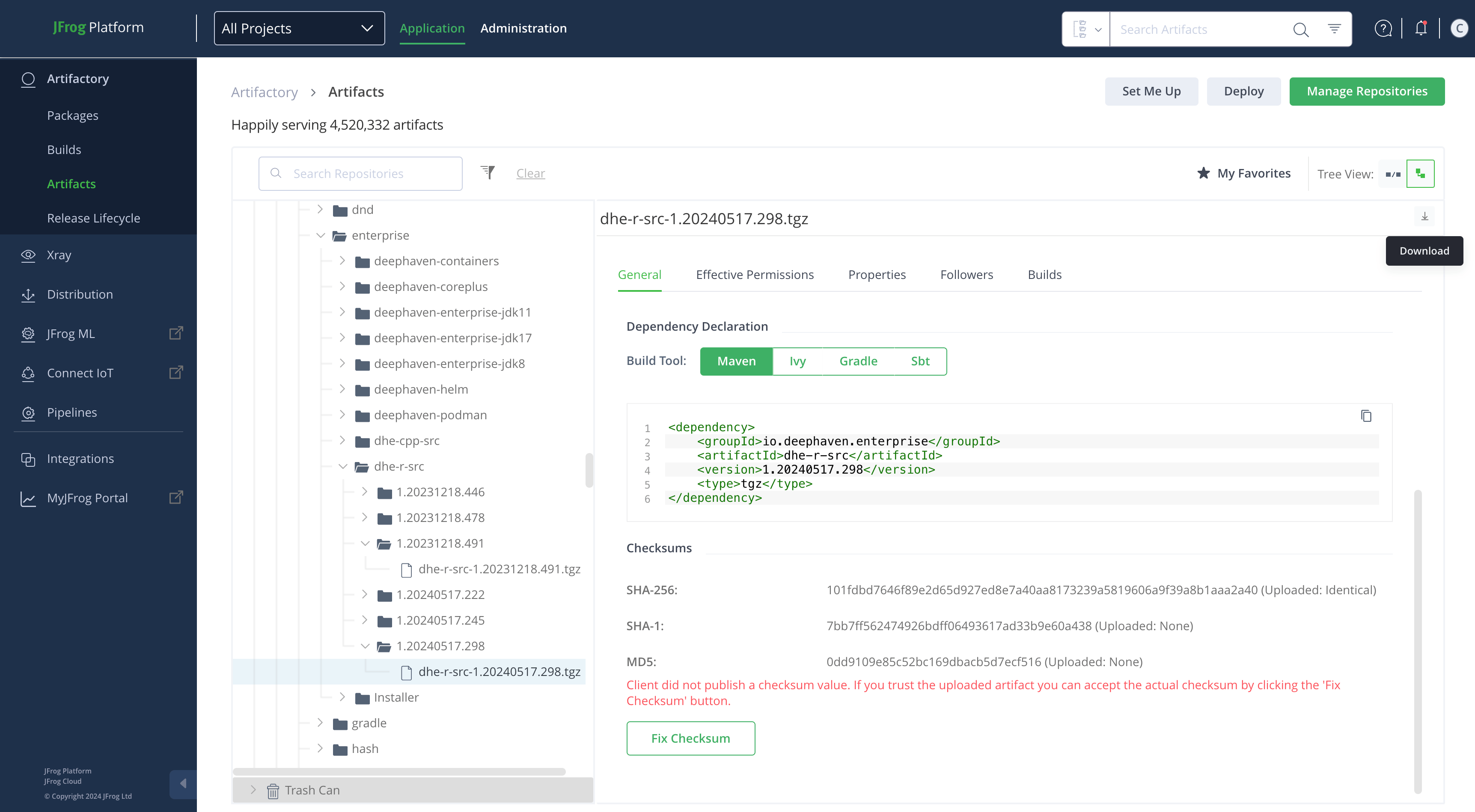 First, download the R client artifact for your version of Deephaven Enterprise from jfrog.io. Navigate to:
