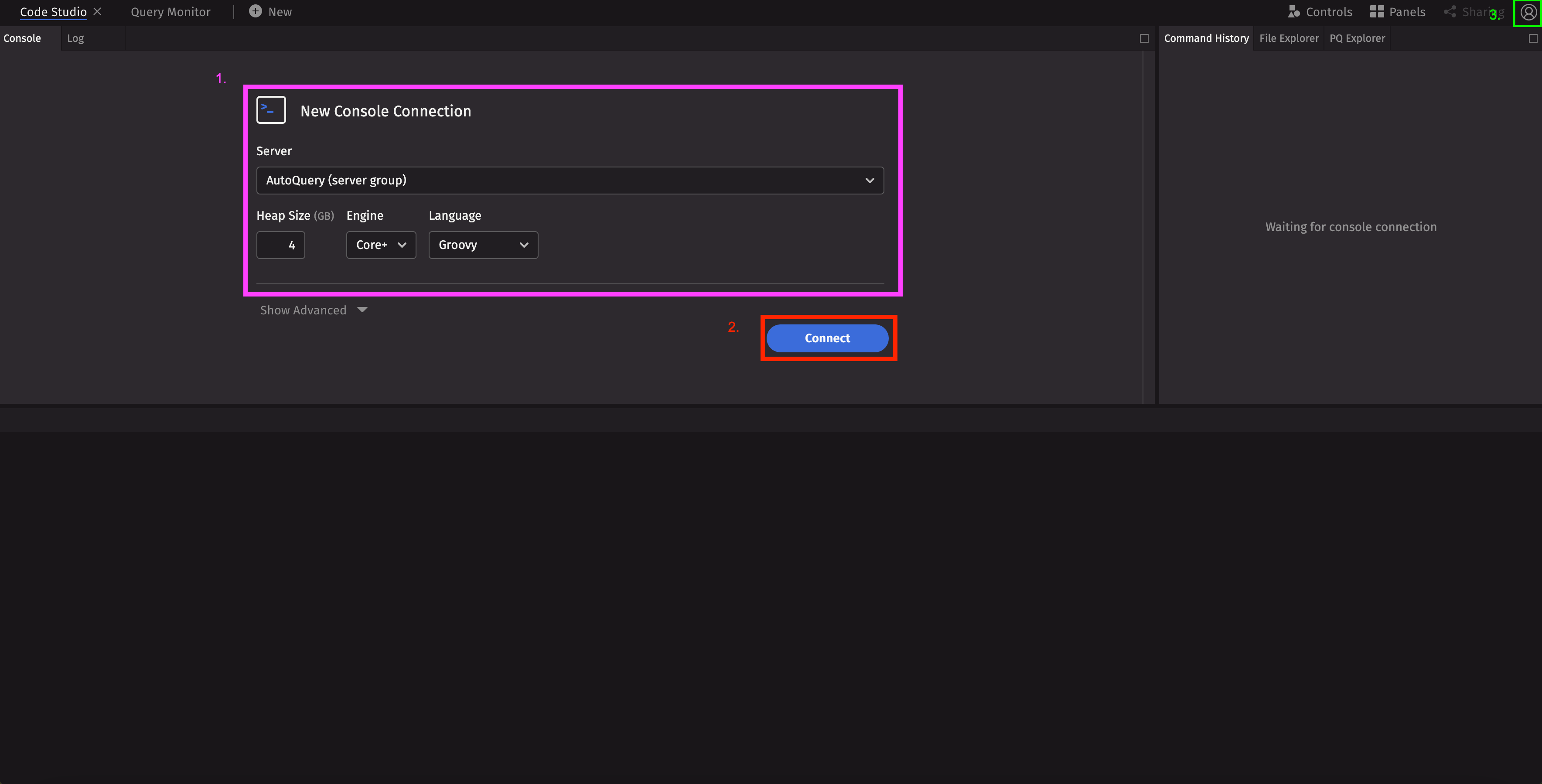 The first thing you will see after logging in as a new user is the Code Studio and a prompt to create a New Console Connection. Once the Code Studio is connected to a server, you can quickly develop and prototype queries.