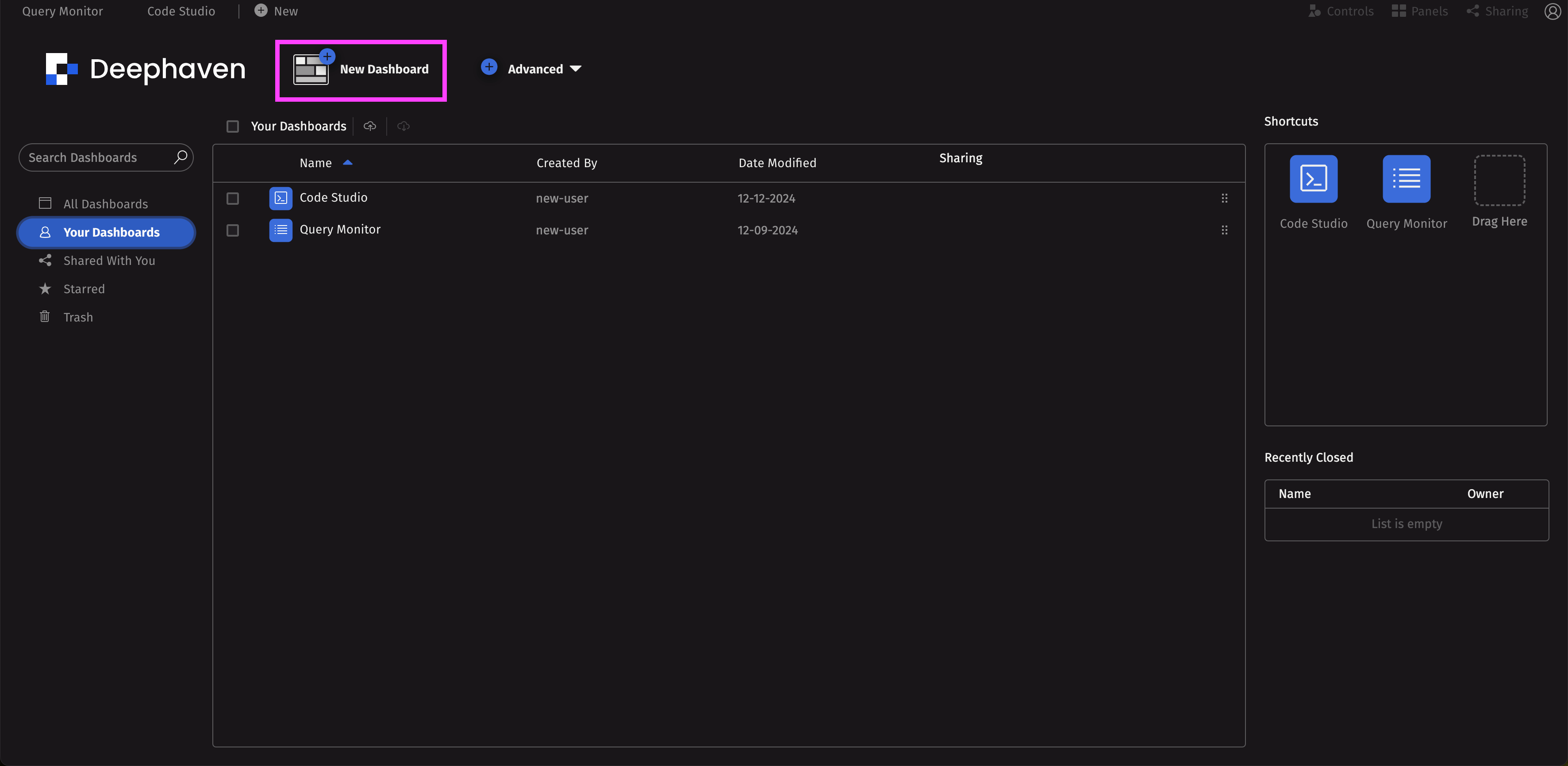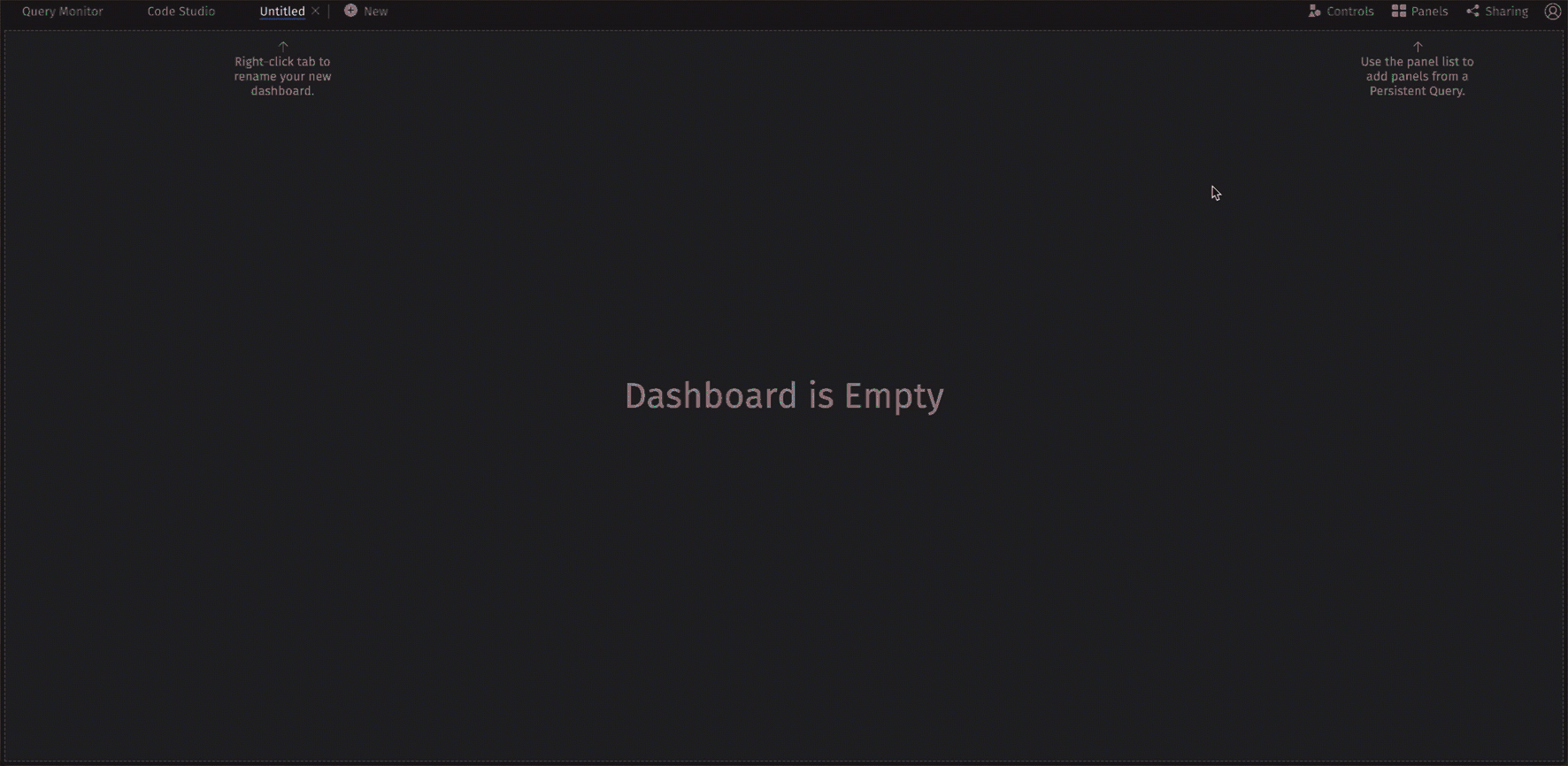 Once your PQ is deployed and running, you can create a dashboard to display its components and share it with others. Click on the +New icon near the Code Studio tab to create a new dashboard.