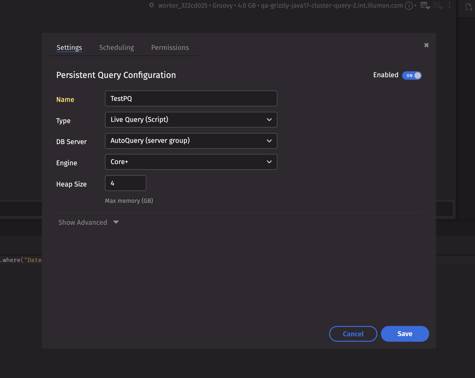 Copy the code from the plotting example into a notebook. The PQ+ button at the top right of the Notebook window opens a Persistent Query (PQ) configuration screen. Name your PQ whatever you want, leave the rest as their default values, and hit the Save button.