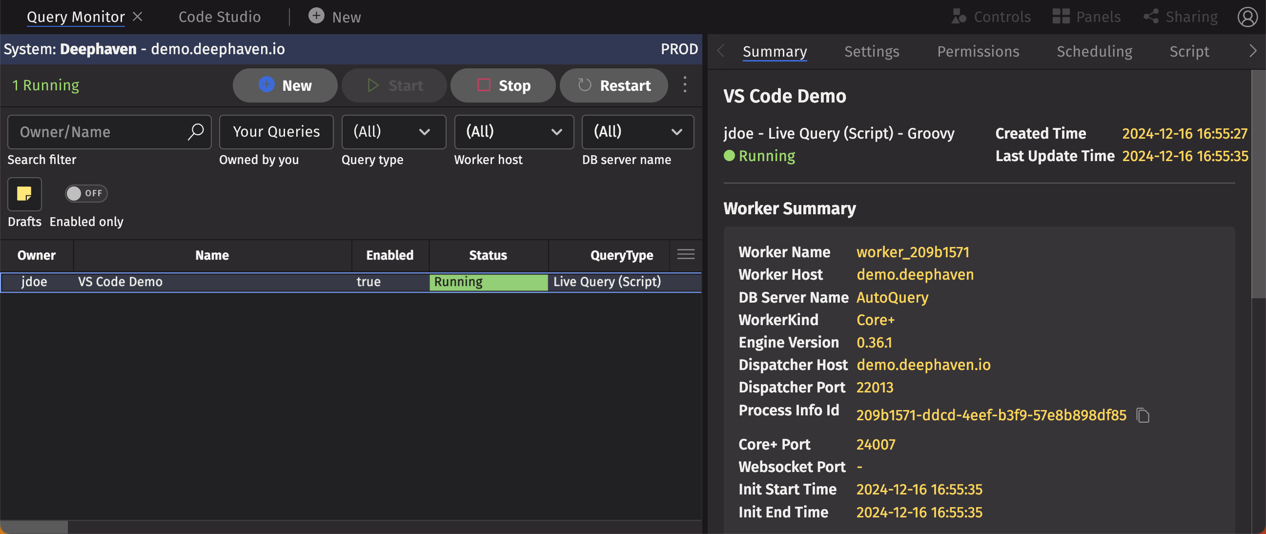 Once you have a working query in VS Code, you can make it a Persistent Query (PQ) in the Deephaven IDE. Queries run from VS Code will only persist within the active session. Making a PQ will allow it to persist in between sessions.