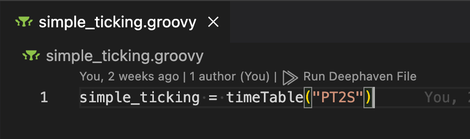 Run the script by clicking the Run Deephaven File action at the top of the file: