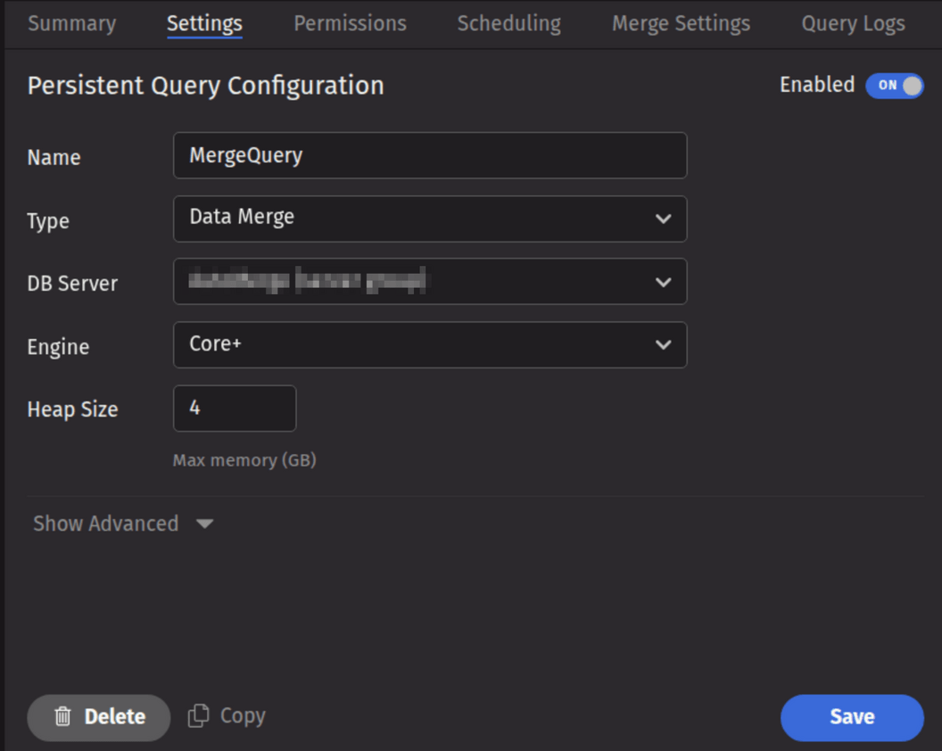 - To proceed with creating a merge query, select a DB Server and enter the desired value (in GB) for Heap Size.