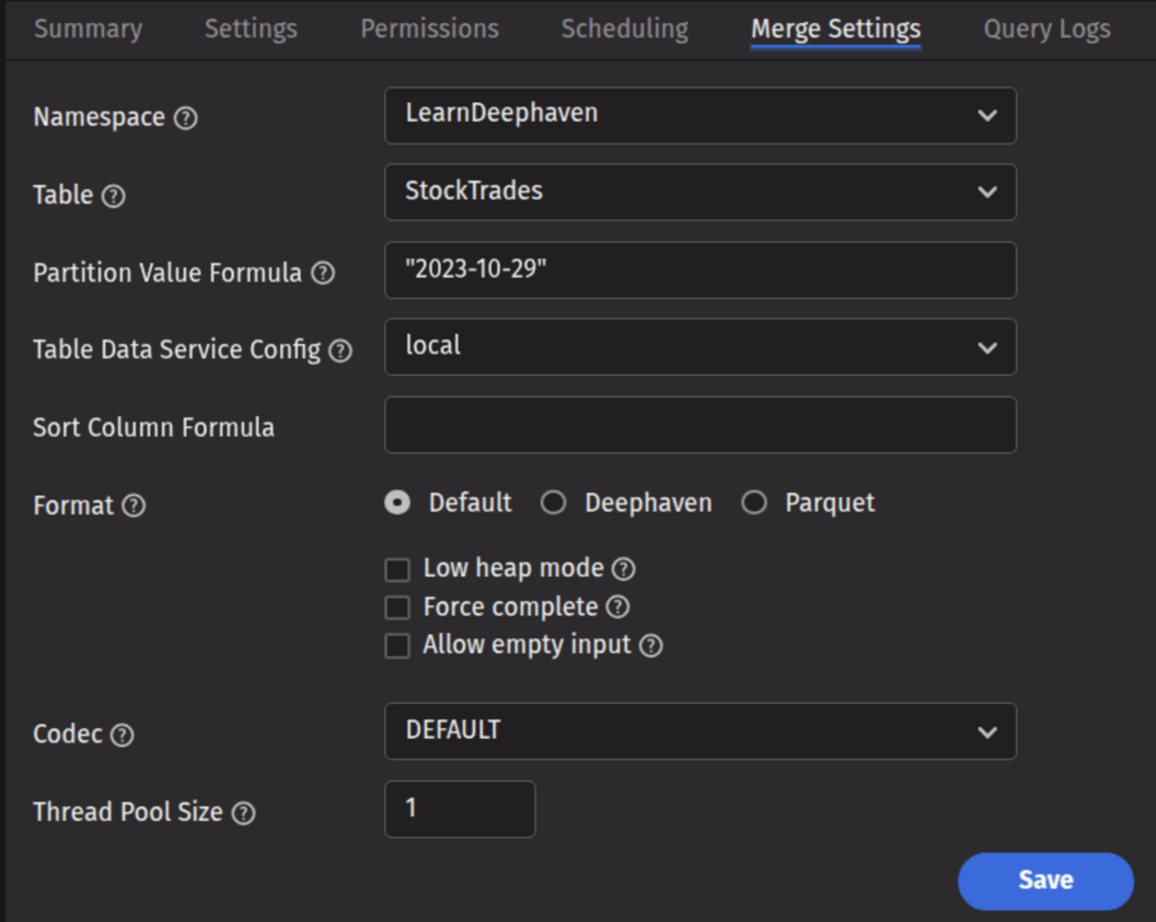- Default: Use the default merge format from the schema. If none is defined, use Deephaven.