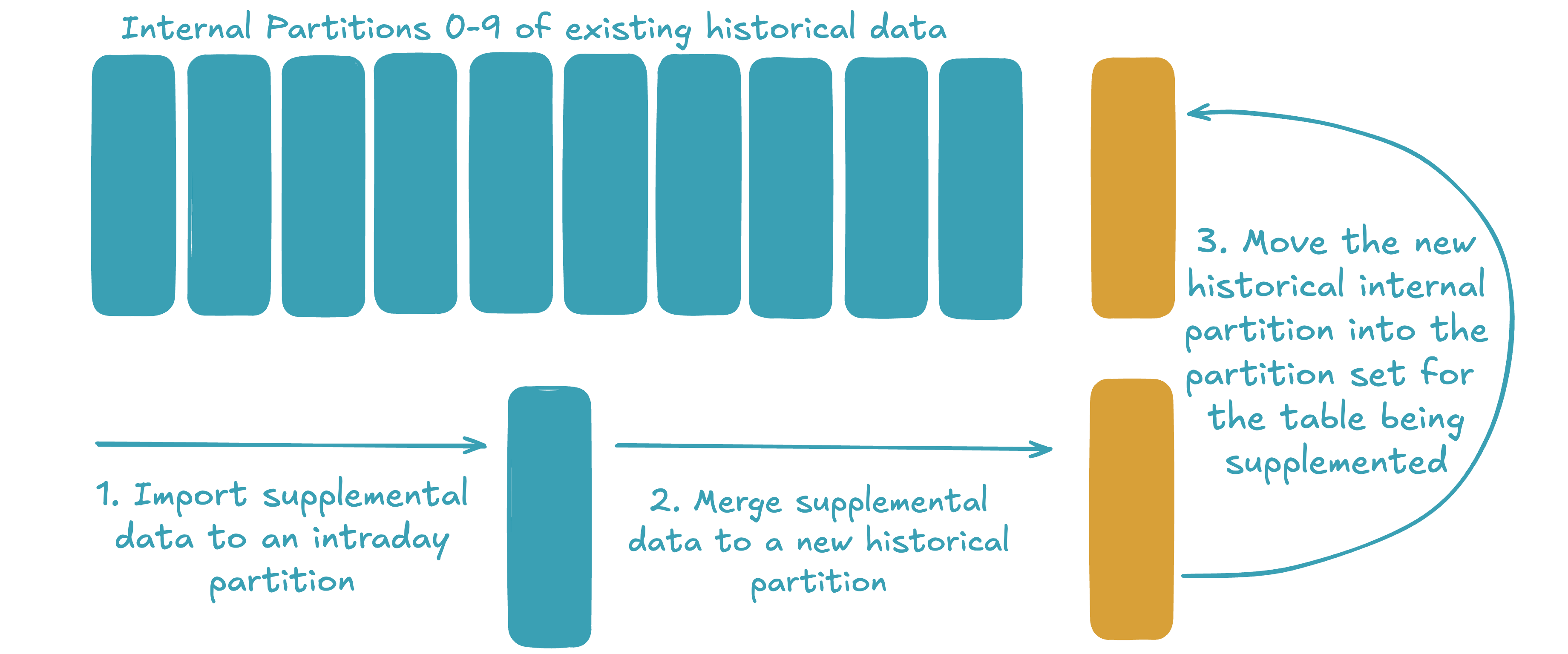 In some cases it may be desirable to add historical data to previous dates without re-merging the data that already exists for these dates. Because Deephaven is an append-only database, supplemental data can extend existing data, but cannot replace it. An effective exception to this, though, is for tables that store data as point-in-time values; in this case, a lastBy would be used to get the latest version of a row, and supplementing historical data could add newer versions to return from the lastBy.