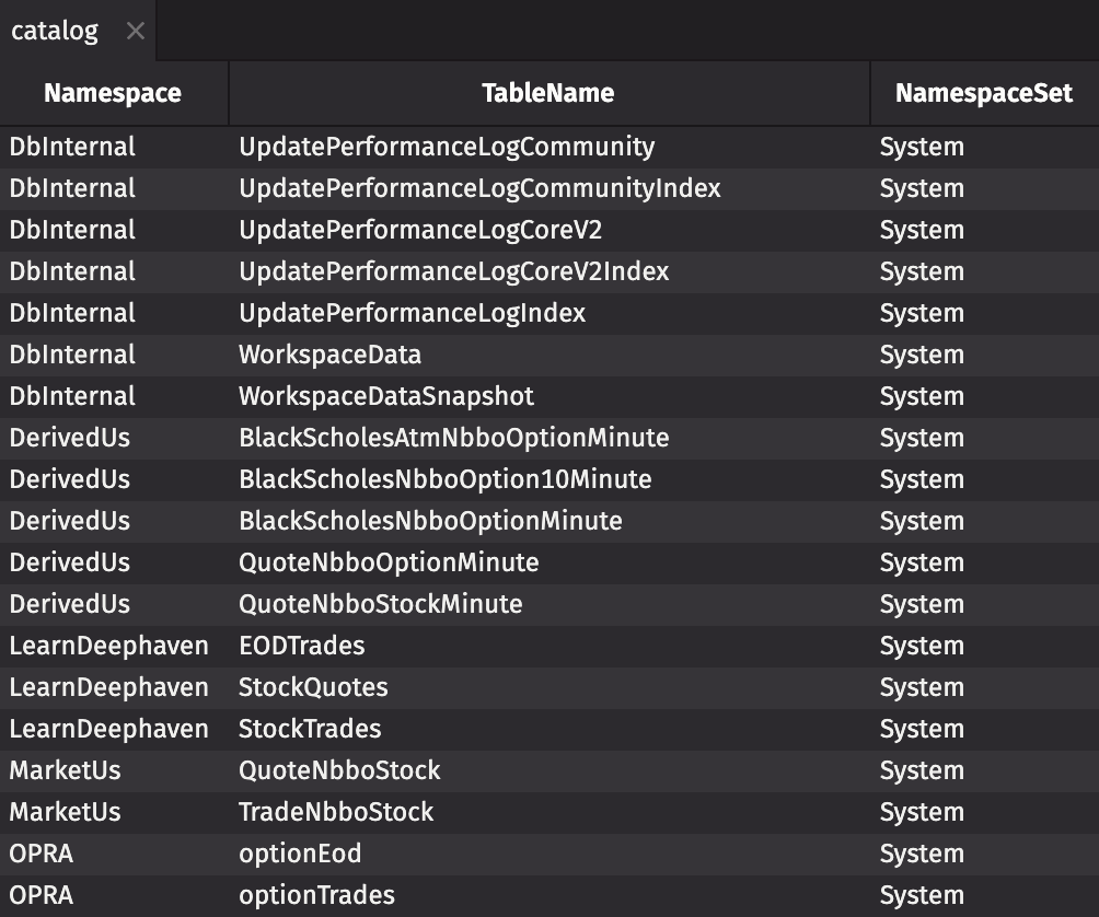 The database catalog provides a list of all available tables across all available Deephaven namespaces and can be retrieved in table format as follows: