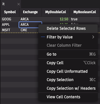 Symbol: The sole key column of typeString.Exchange: A value column of typeString.MyDoubleCol: A value column of typefloat64(double).MyBooleanCol: A value column of typebool.