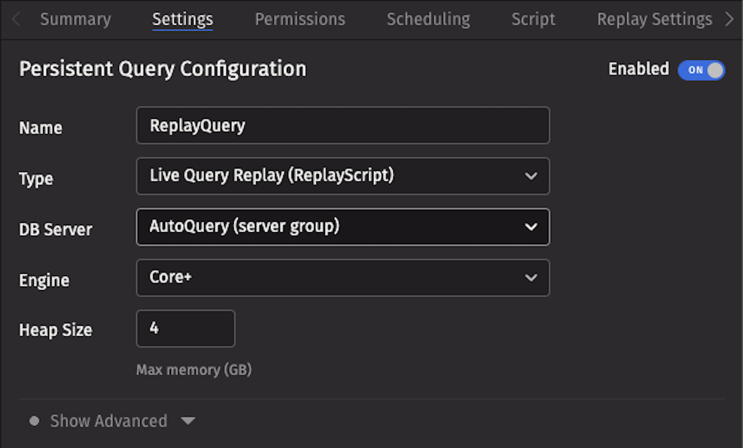 Configure the query in the Replay Settings tab.