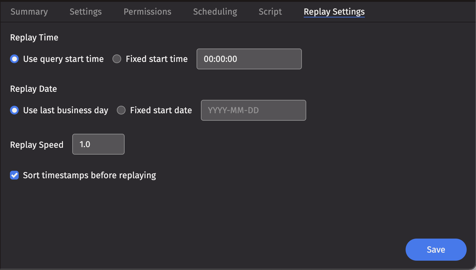 The Replay Time configuration provides two options that control the time of day that the script will begin.