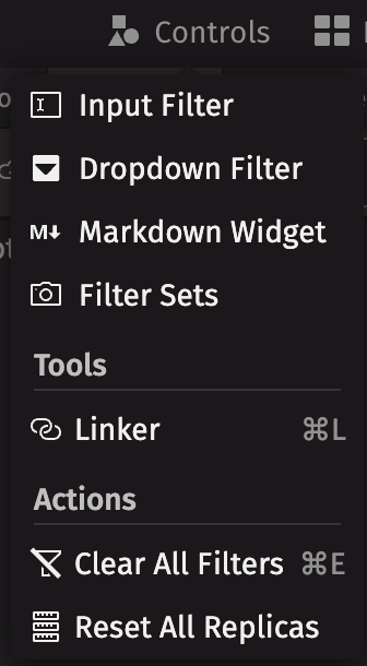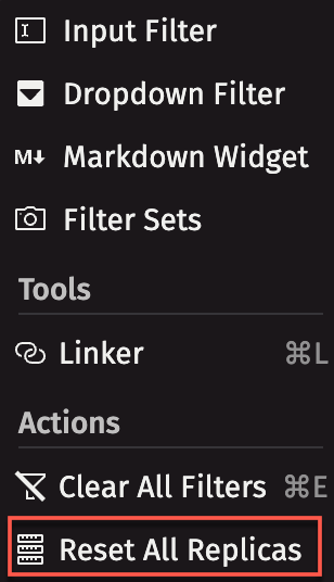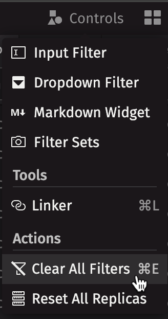 The Actions tab in the Controls menu provides options to clear all filters, and to reset Replica workers.