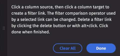 Click Clear All to remove your links. Use Remove All Filters or Remove Column Filter in the table context menu to restore the tables to their original state.