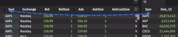 Now that the tables are linked, double-clicking on a row in the Sym column in t2 will automatically filter the contents of t1. In this example, double-clicking on GOOG in the source table filters the target table to show only rows with the GOOG symbol: