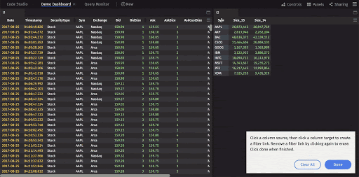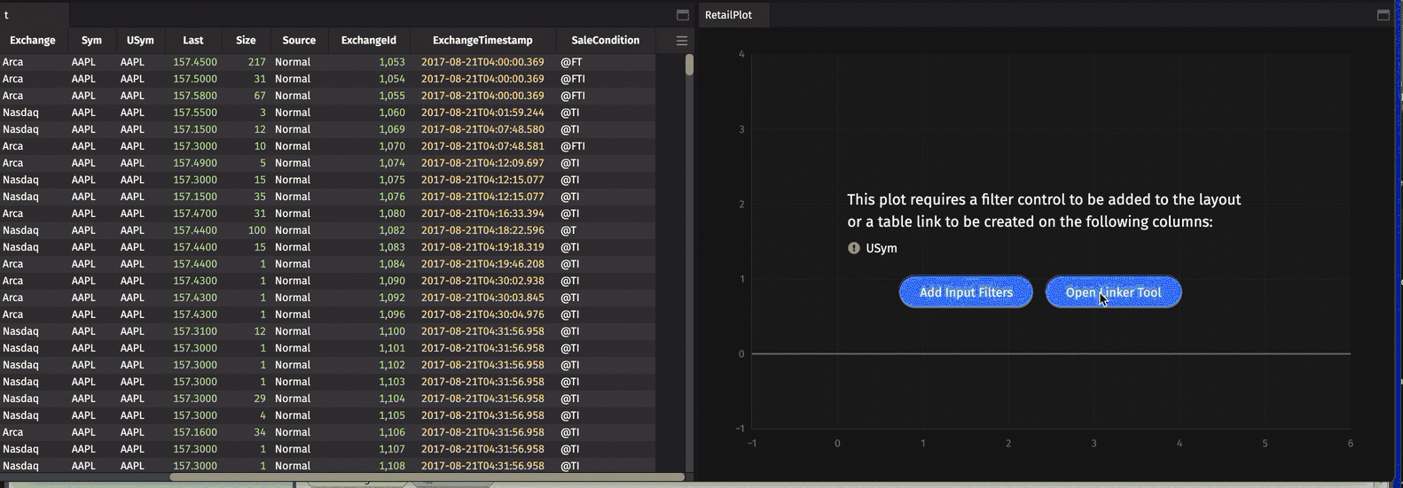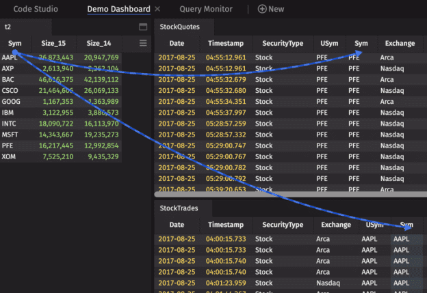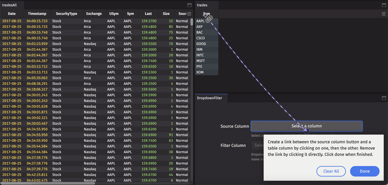 Deephaven's Linker feature enables a user to interactively filter the content in one table based on the content selected in another table. The objects must first be "linked" with each other, with one table as the source and one or more other tables as the target(s). When a cell in the source table is double-clicked, the respective columns in the target table are filtered to that value.