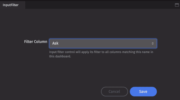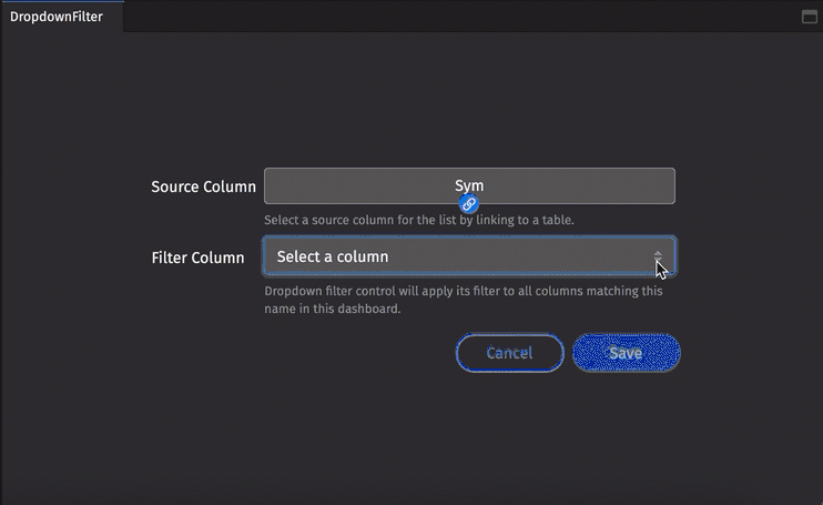The Dropdown Filter control takes a source column as an input and filter column as an output. It uses the source column to create a dropdown list of filter options. Selecting a value from this list filters all columns in the dashboard that match the filter column name by the selected value.